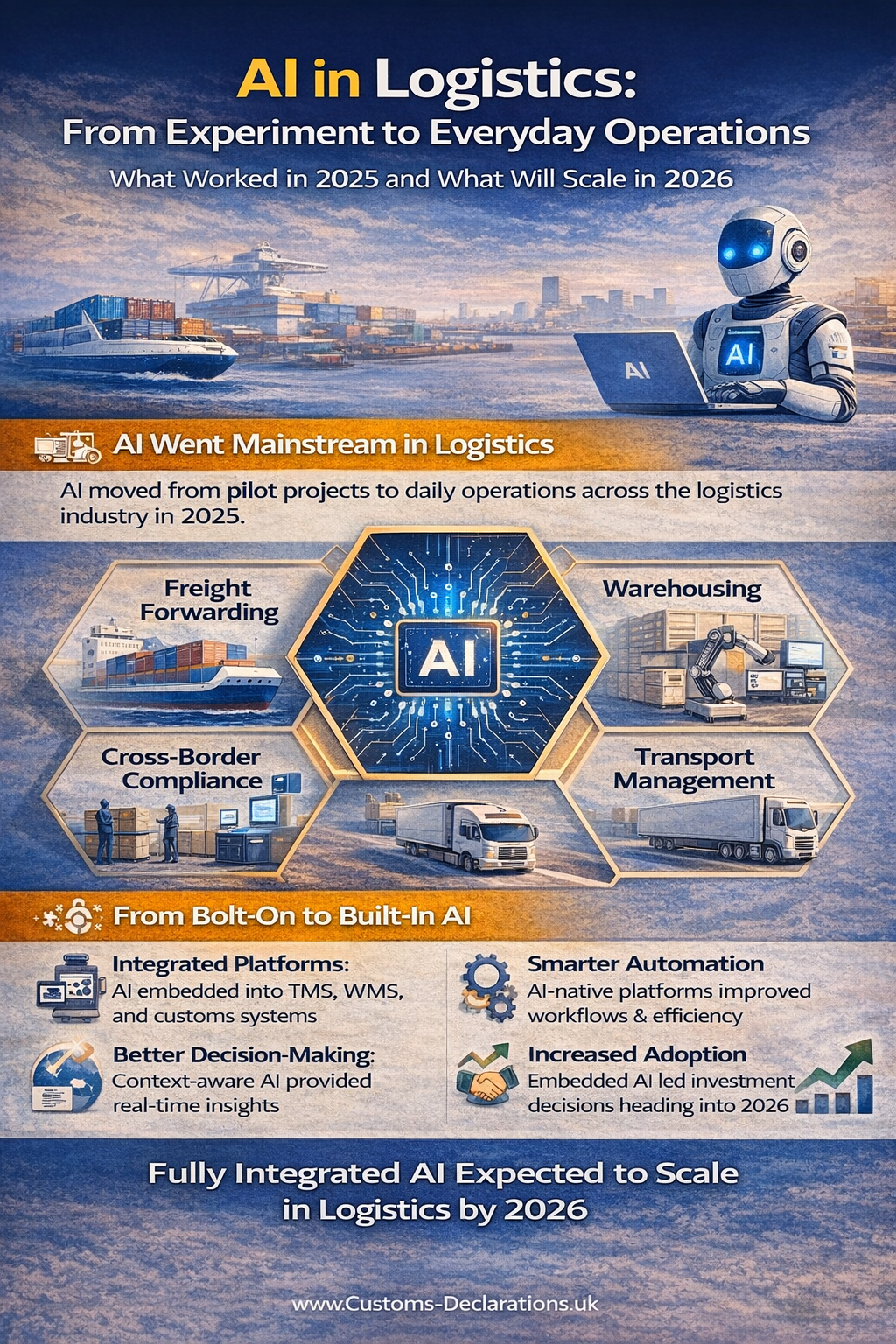 For most of the past decade, artificial intelligence in logistics occupied a familiar position: full of promise, short on proof. Pilot programmes generated impressive case studies, but genuine operational embedding remained elusive. That changed meaningfully in 2025. Across freight forwarding, warehousing, cross-border trade compliance, and transportation management, AI moved from the experimental fringe into the daily workflow. The shift carries real implications for logistics operators, customs professionals, and technology buyers heading into 2026.