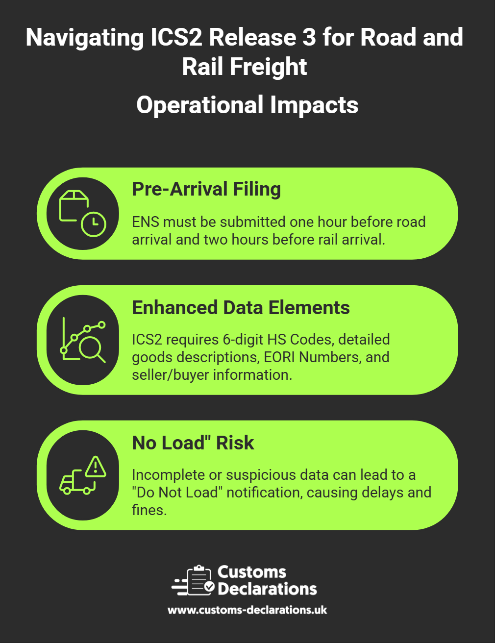 Under ICS2, if the data is incomplete or suspicious, customs authorities can issue a “Do Not Load” (DNL) notification. For road transport, this effectively translates to a “Do Not Proceed” order. If a truck arrives at the border without a successfully processed ENS, it will be held, resulting in significant delays, potential fines, and a cascading failure of the delivery schedule.