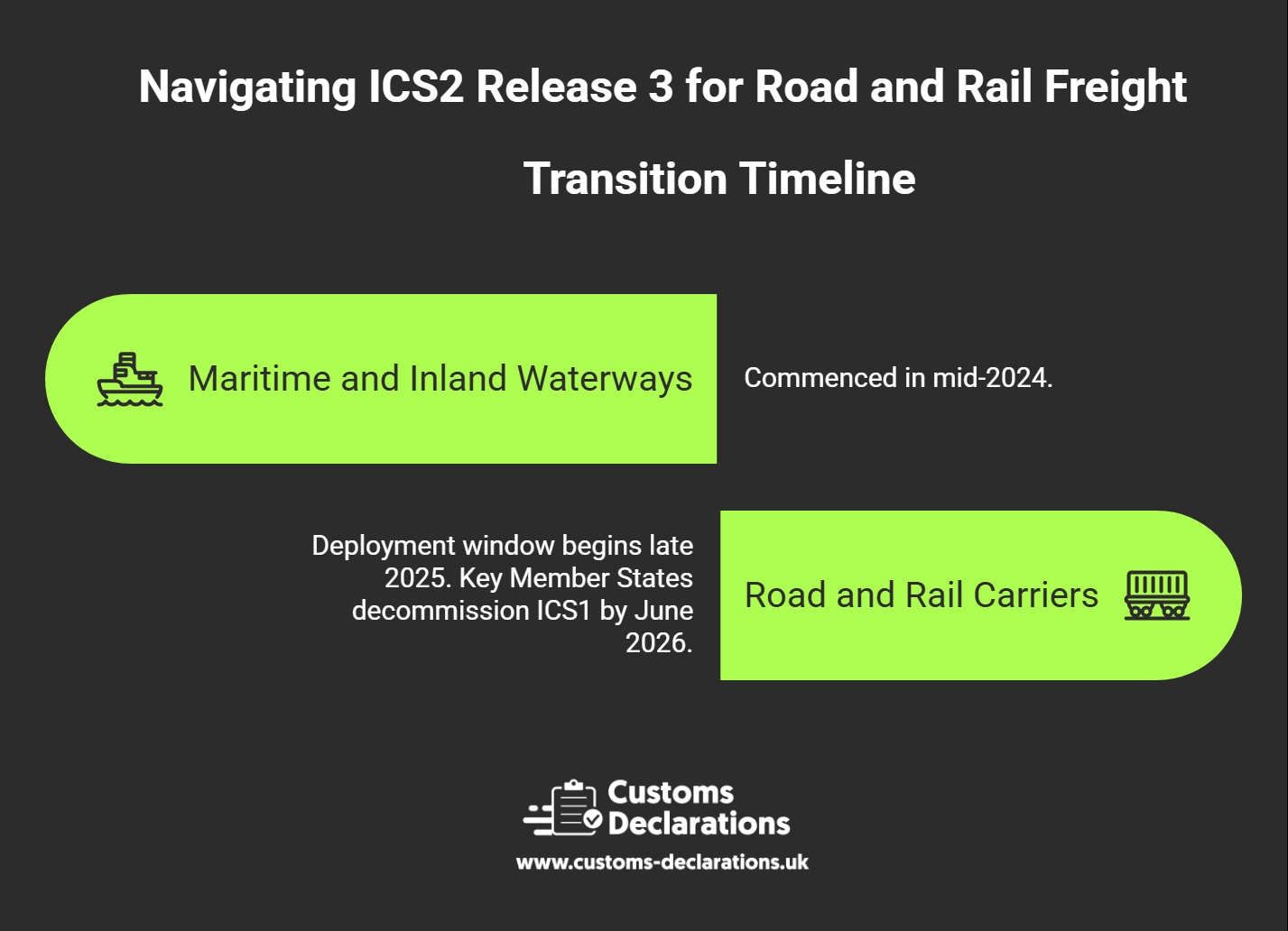 • Road and Rail Carriers: The deployment window for land-based transport begins in late 2025, with several key Member States (including Poland, Romania, and Slovakia) decommissioning ICS1 for road transport by June 2026.
