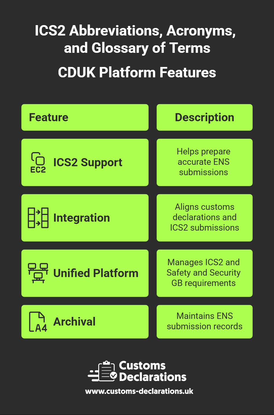 The Customs Declarations UK platform provides comprehensive support for businesses navigating ICS2 requirements alongside their broader customs compliance obligations. Through wizard-based workflows and real-time validation, CDUK helps traders prepare accurate ENS submissions that meet ICS2 data quality standards. The platform’s integration with carrier safety and security filings ensures alignment between customs declarations and ICS2 submissions, preventing the mismatches that commonly cause border delays.