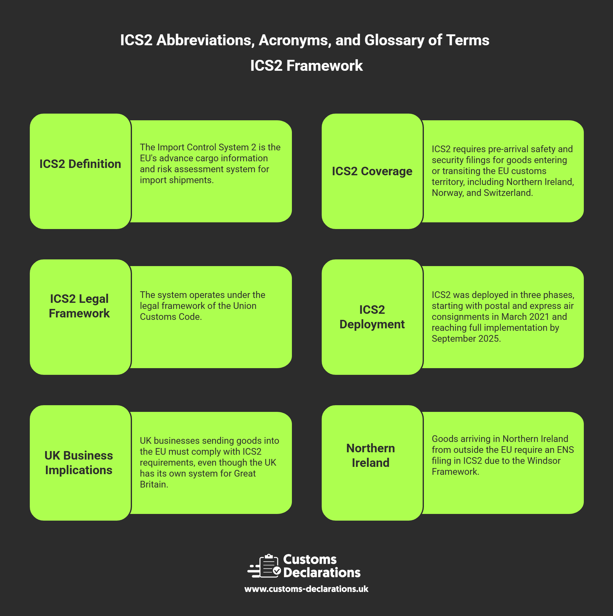 The Import Control System 2 represents the most significant transformation of European customs border security in decades. For UK businesses exporting to the European Union, understanding this system is not merely helpful but essential for maintaining uninterrupted trade flows. As ICS2 Release 3 became fully operational on 1 September 2025 across all transport modes, the terminology and technical vocabulary surrounding this system has become the language of cross-border commerce. This comprehensive reference document provides UK traders, freight forwarders, hauliers, and customs professionals with an exhaustive guide to every abbreviation, acronym, and technical term they will encounter when navigating ICS2 compliance.