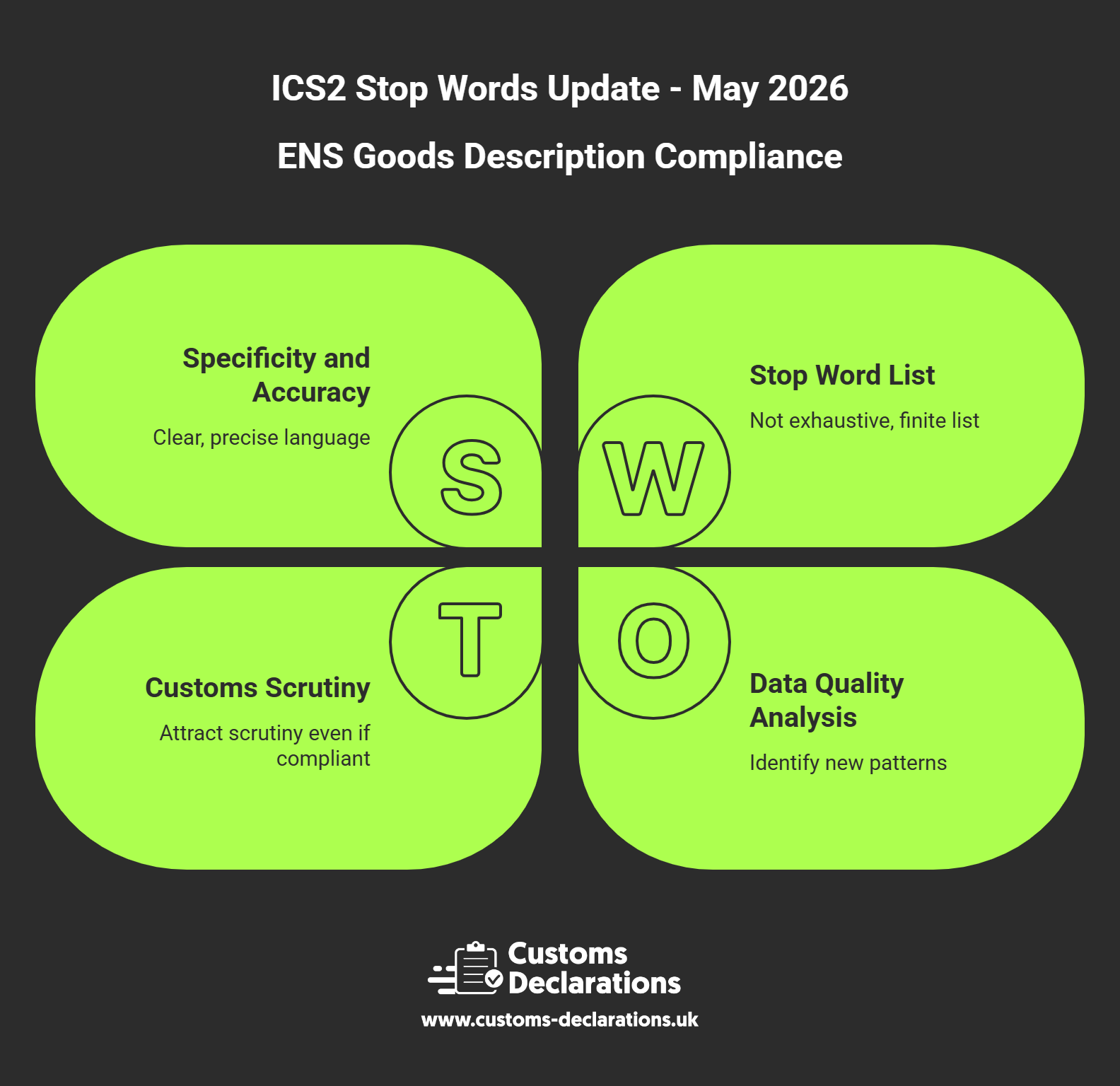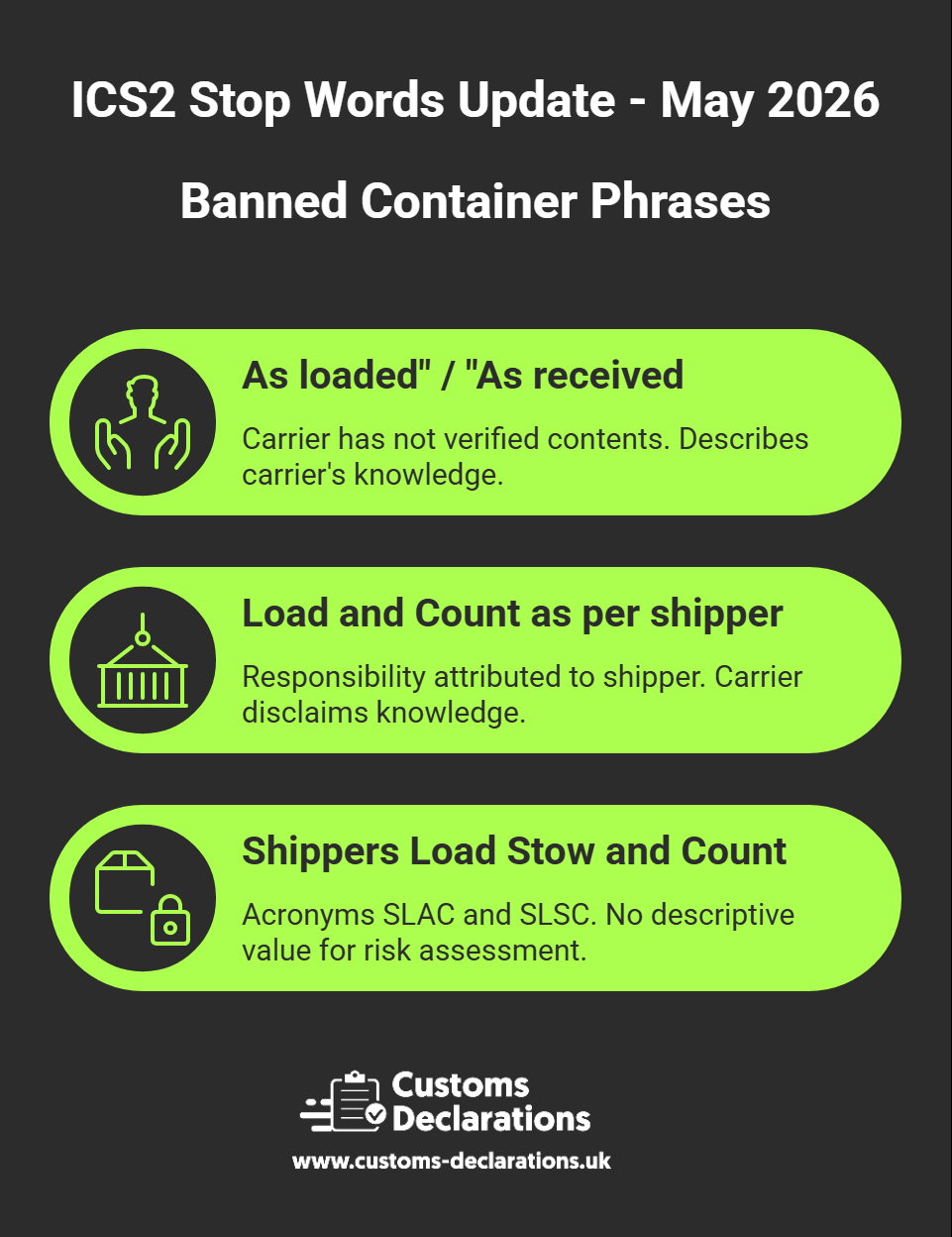The European Commission’s Directorate-General for Taxation and Customs Union has published a further update to the list of stop words and phrases prohibited in Entry Summary Declaration (ENS) goods descriptions under the Import Control System 2 (ICS2). Nine new terms become enforceable on 4 May 2026, adding to the growing body of banned language already active since the system’s initial deployment. Carriers, freight forwarders, customs agents, and anyone filing ENS declarations must audit their commodity description templates and standard operating procedures before that date to avoid automatic rejection by the ICS2 Common Repository.