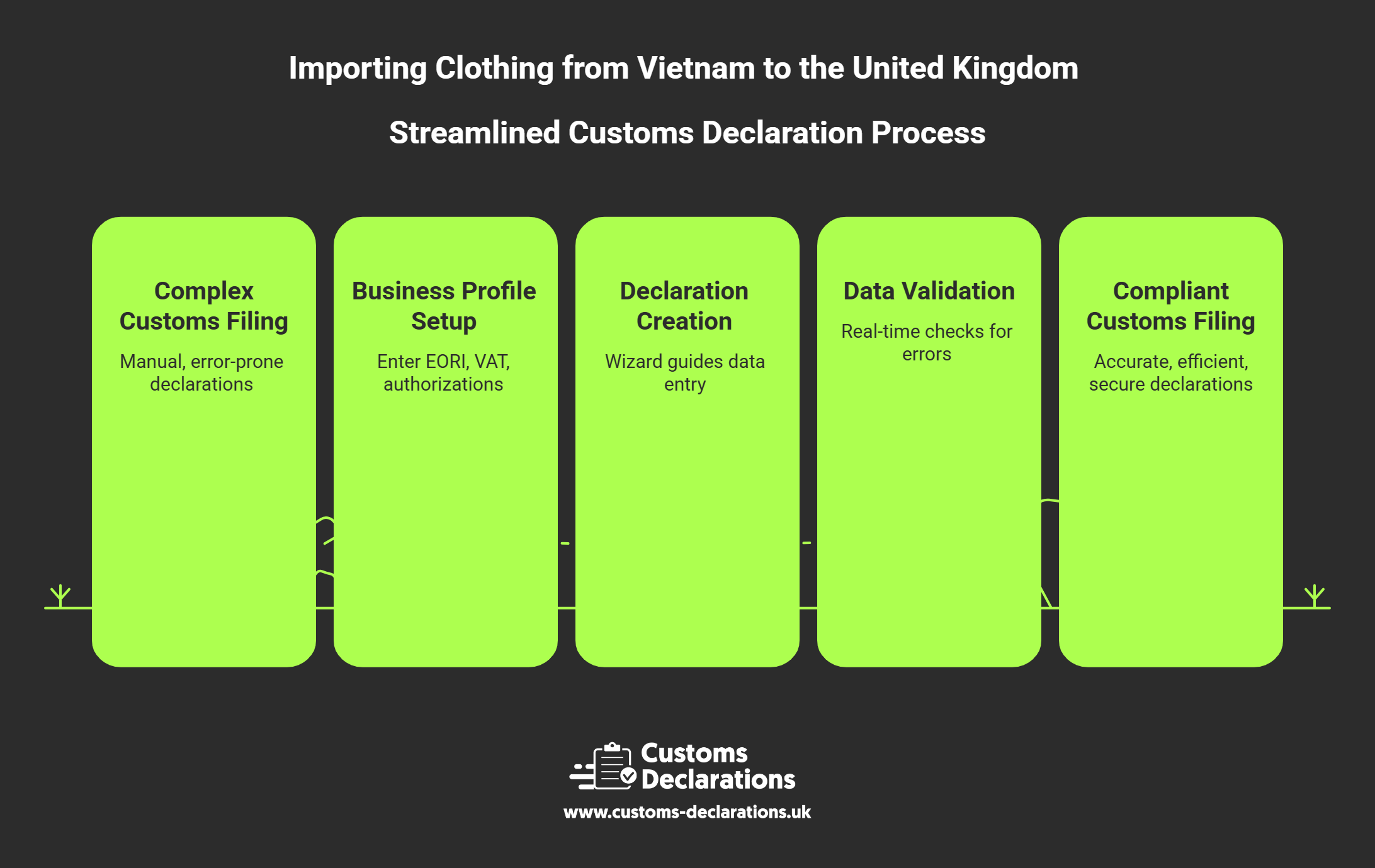 Within the CDUK platform, importers begin by setting up their business profile, including the GB EORI number, VAT registration details, and any relevant customs authorizations or approvals. Once the profile is established, users can create new customs declarations for each shipment of Vietnamese clothing. The platform presents a wizard-based interface that walks users through each required data element in plain English, reducing the complexity of navigating CDS codes and technical jargon. Importers enter key information including the consignor and consignee details, the commodity classification code determined during the product research phase, the customs value and its components, the country of origin, and the preferential tariff treatment being claimed under UKVFTA.
