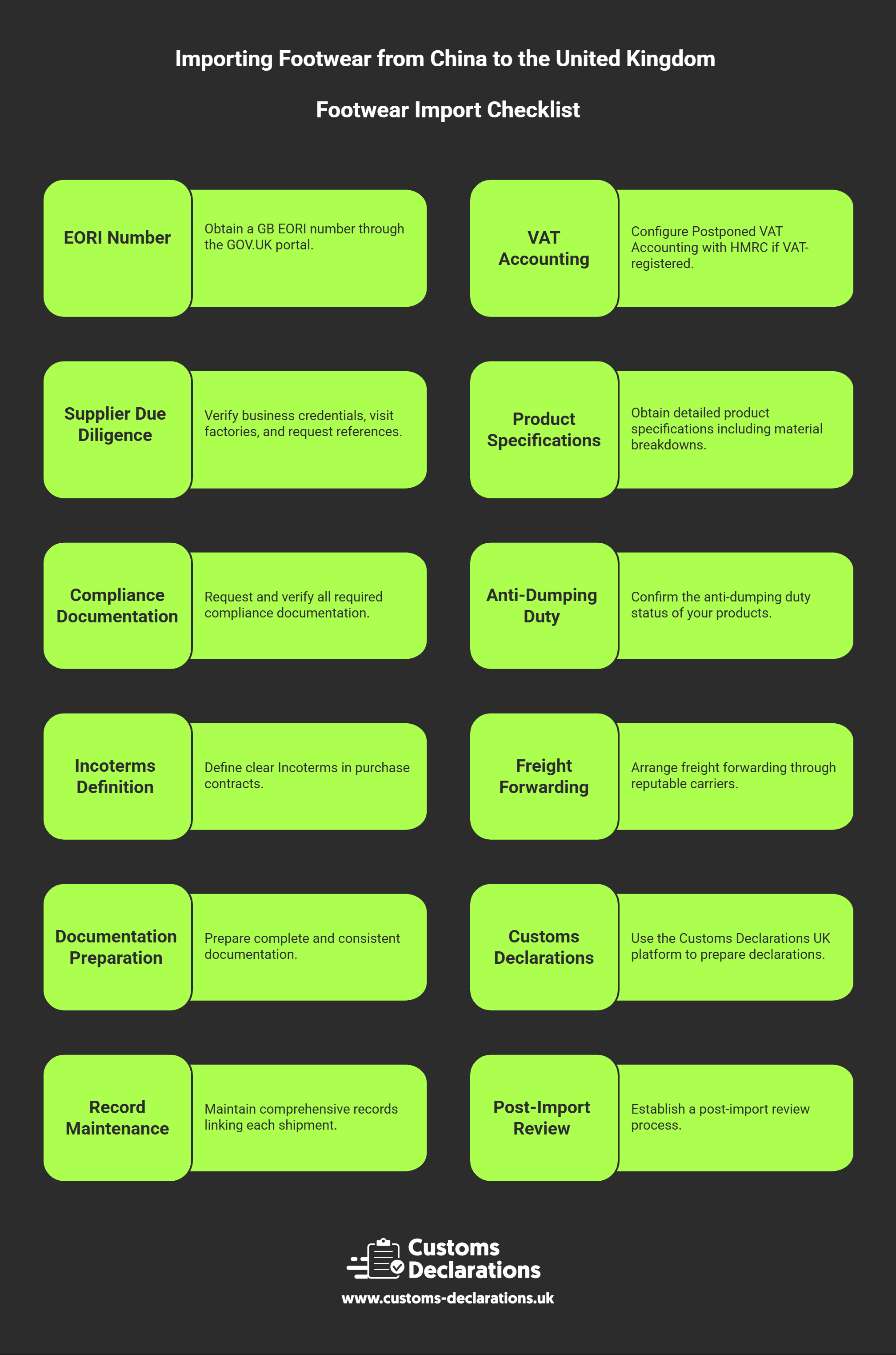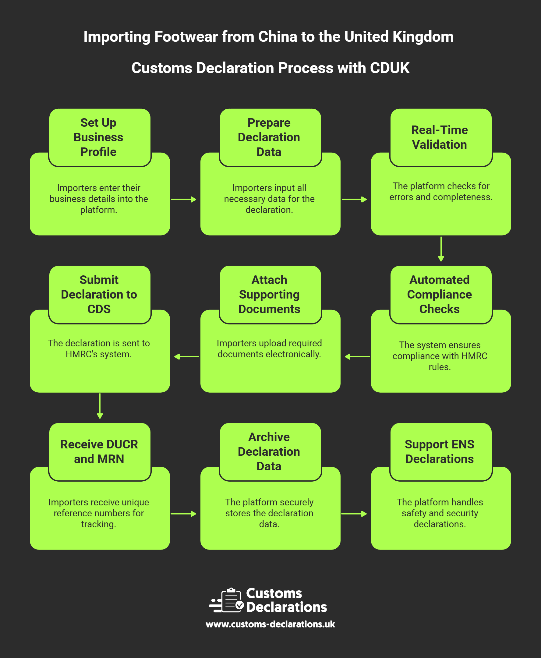 Importing footwear from China to the United Kingdom offers compelling commercial opportunities when executed with precision and structured compliance. Success requires mastering the interplay between accurate customs classification, comprehensive product safety due diligence, correct application of anti-dumping measures, transparent customs valuation, and systematic documentation management. By understanding the post-Brexit regulatory landscape, investing in supplier relationships built on quality and compliance, and leveraging modern digital tools such as the Customs Declarations UK platform for validated, audit-ready filings, importers transform complex cross-border trade into a repeatable, low-friction business process. The combination of supplier diligence, accurate declarations filed through CDUK, proactive compliance monitoring, and strong record-keeping creates a foundation for sustainable growth, whether importing single container loads or managing high-volume footwear distribution operations. Maintaining these controls ensures that future shipments clear efficiently, costs remain predictable, and compliance obligations are met consistently across customs, product safety, and environmental dimensions.