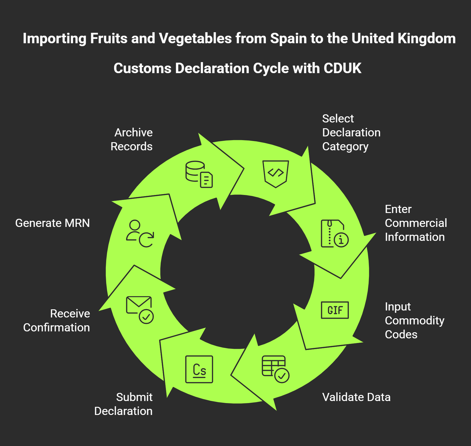 Once the declaration data is complete and validated, CDUK submits the entry electronically to CDS and receives immediate confirmation of acceptance or rejection. Upon acceptance, the system generates and displays the Movement Reference Number (MRN), which serves as the unique identifier for the import transaction and is used by border authorities, carriers, and warehouse operators to track the consignment’s clearance status. CDUK automatically archives the full declaration record, including all supporting documents and status messages, for the statutory retention period of six years, ensuring that importers can respond promptly to HMRC audits, respond to post-clearance queries, and maintain compliance with record-keeping obligations. For businesses importing multiple consignments of Spanish produce on a regular basis, CDUK’s template and cloning features enable rapid declaration creation by reusing standard data fields and adjusting only variable elements such as shipment dates, quantities, and invoice values.
