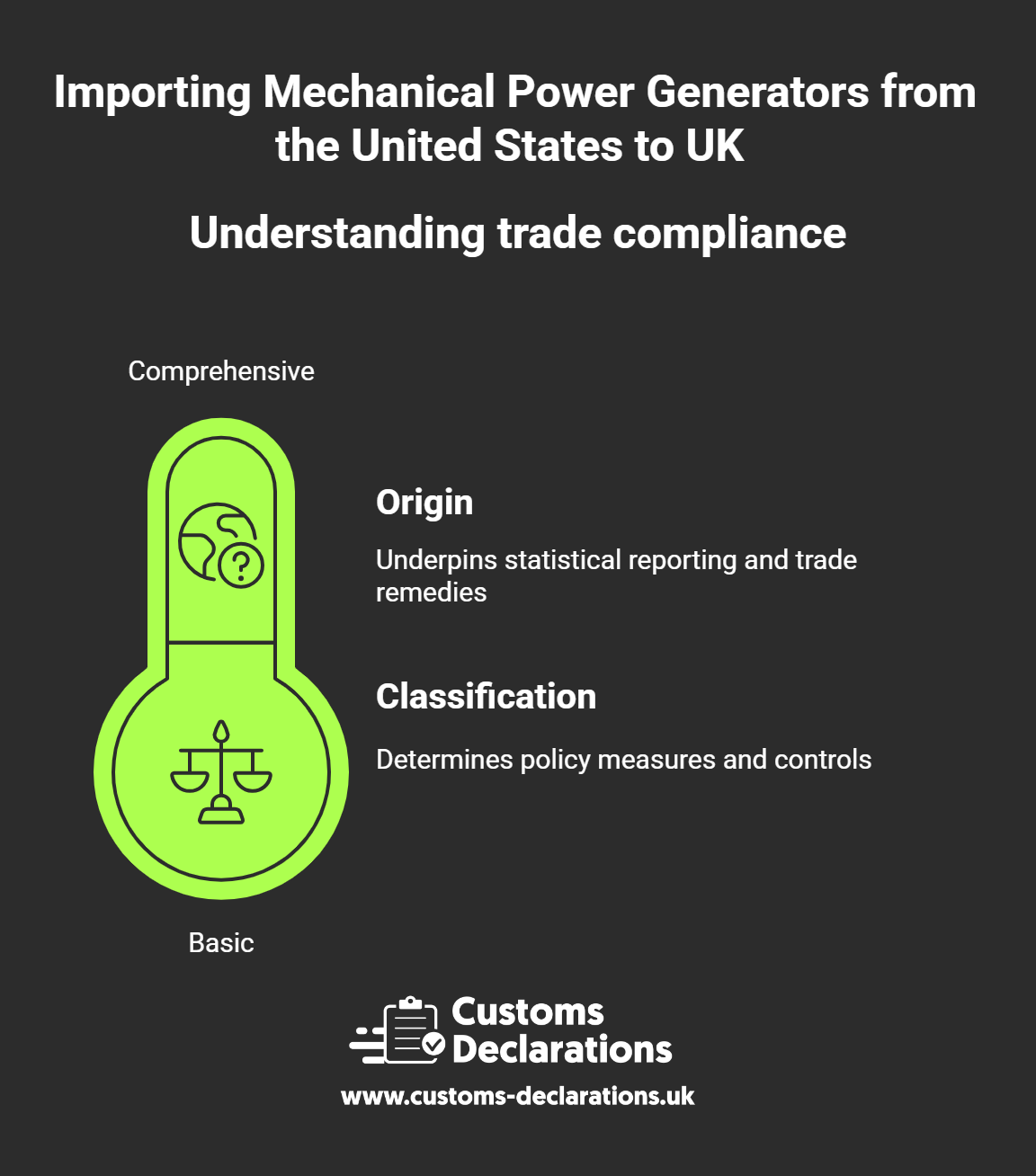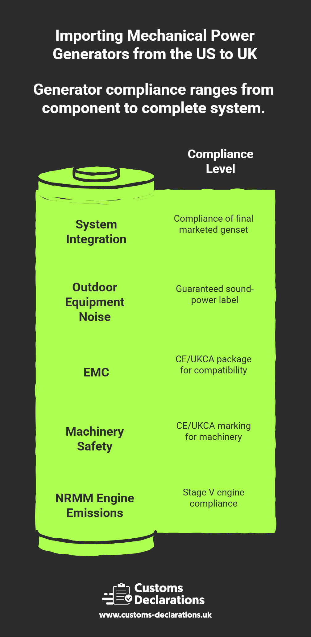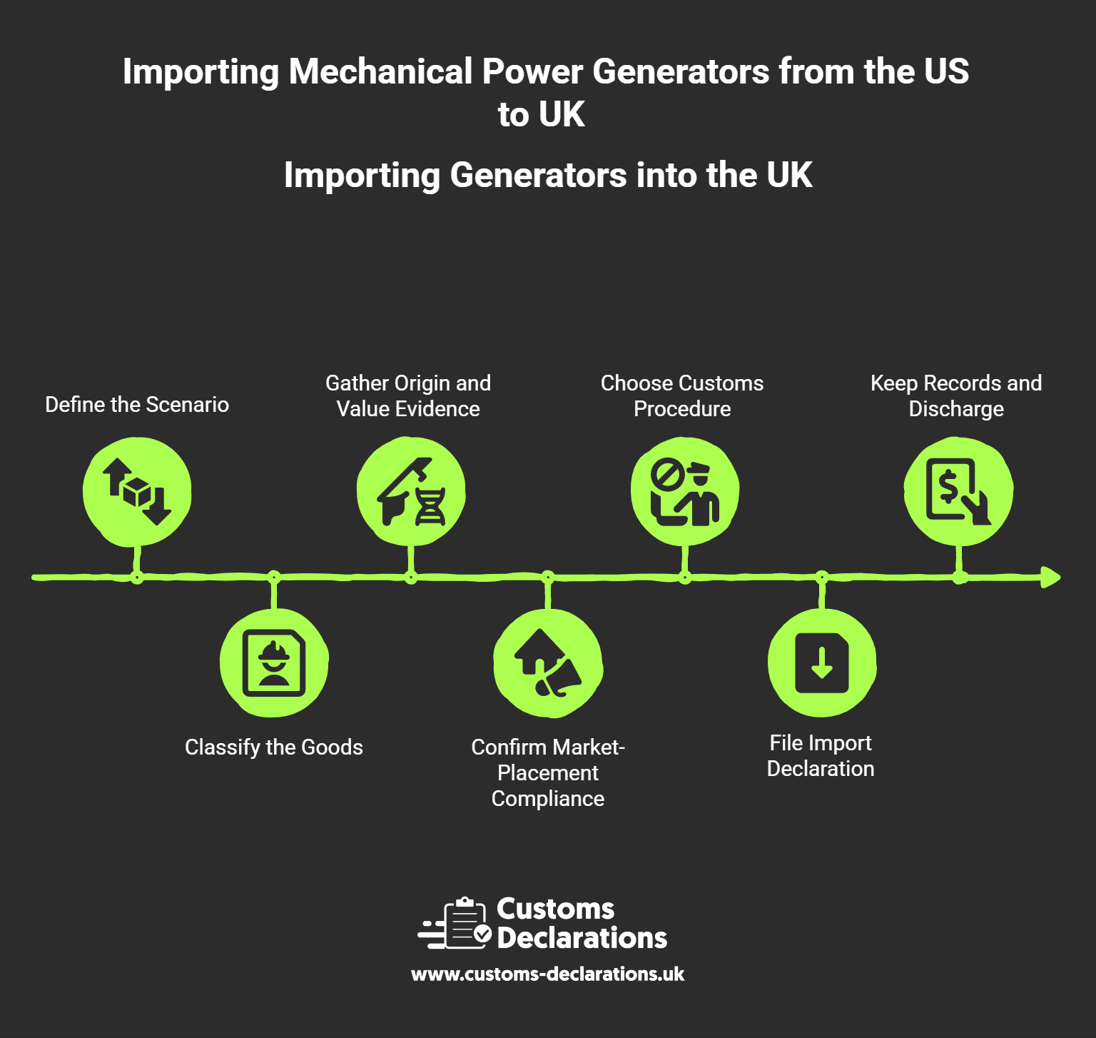 Mechanical power generators—complete generating sets, diesel and gasoline prime movers, alternators, and spare parts—are indispensable across construction, healthcare, data centres, and emergency response. Bringing these units from the United States into Great Britain (GB) is entirely manageable when approached as a single, evidence-led workflow. That workflow has three pillars: (1) accurate customs treatment built on sound classification, origin and valuation; (2) product-compliance readiness spanning machinery safety, electromagnetic compatibility, non-road engine emissions, and outdoor noise; and (3) a clean, validated import submission through HMRC’s Customs Declaration Service (CDS), ideally prepared in Customs Declarations UK (CDUK) for audit-grade consistency. This guide walks that sequence step by step, highlights reliefs for test and demonstration units, and concludes with practical controls that keep your programme on time and inspection-ready.