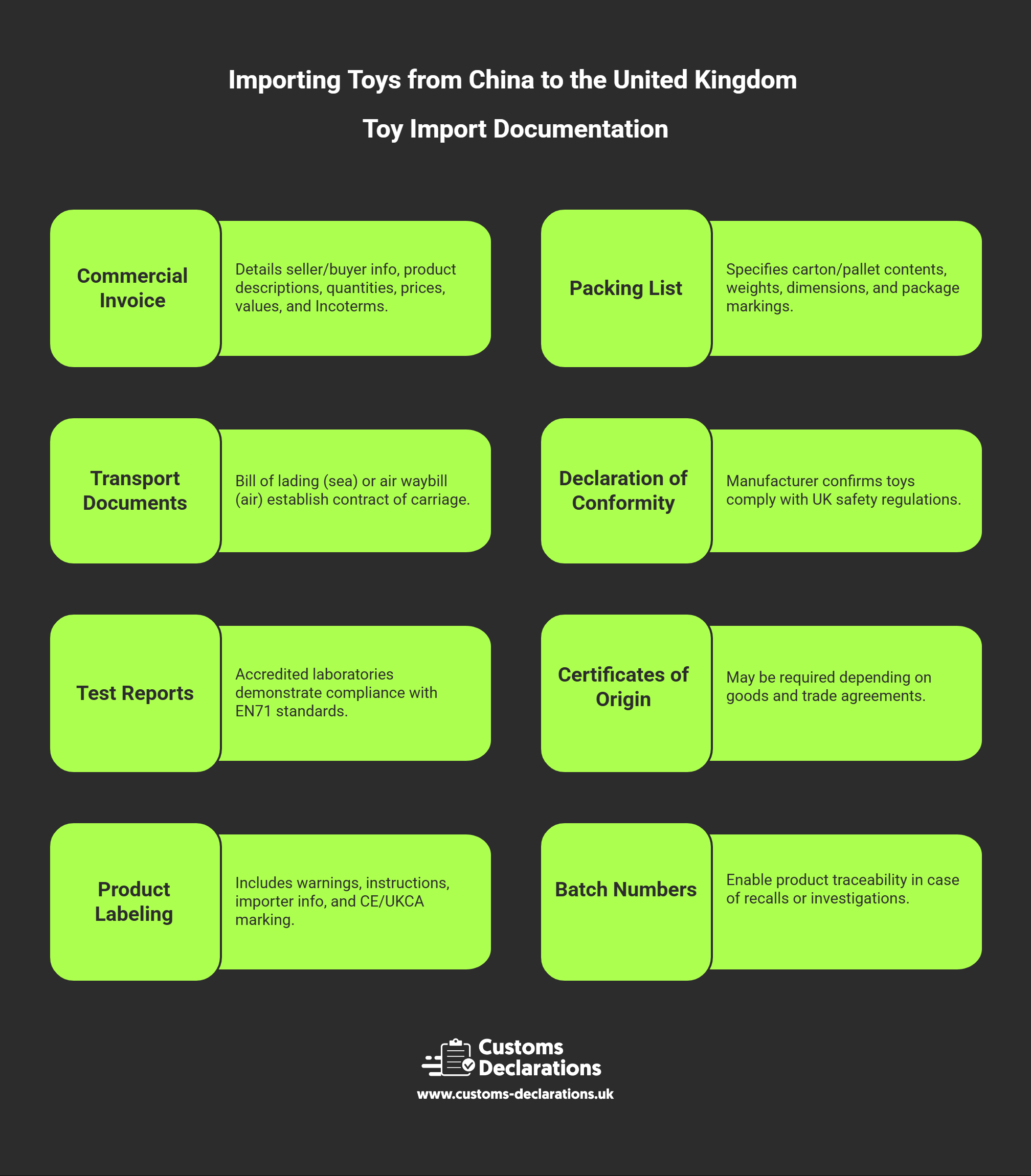 Complete and consistent documentation enables efficient customs clearance and provides essential evidence for regulatory compliance throughout the product lifecycle. Every toy import requires a commercial invoice detailing the seller’s and buyer’s information, complete product descriptions, quantities, unit prices, total values, and agreed Incoterms. The packing list specifies the contents of each carton or pallet, including gross and net weights, dimensions, and package markings that correspond to physical labeling on the shipment. Transport documents including the bill of lading for sea shipments or air waybill for air cargo establish the contract of carriage and provide proof of shipment from origin to destination. The Declaration of Conformity issued by the manufacturer confirms that the toys comply with relevant UK safety regulations and must reference the specific standards against which conformity has been assessed. Test reports from accredited laboratories demonstrating compliance with EN71 standards provide the technical evidence supporting the Declaration of Conformity. Certificates of origin may be required depending on the nature of the goods and applicable trade agreements, though no preferential tariff arrangements currently exist between the UK and China. Product labeling must include warnings appropriate to the age range, usage instructions, the importer’s UK business name and address, and the CE or UKCA marking as applicable. Batch or serial numbers enable product traceability in the event recalls or safety investigations become necessary. Maintaining organized documentation systems with clear links between commercial documents, compliance certificates, and customs declarations significantly improves response times to customs queries and regulatory audits.